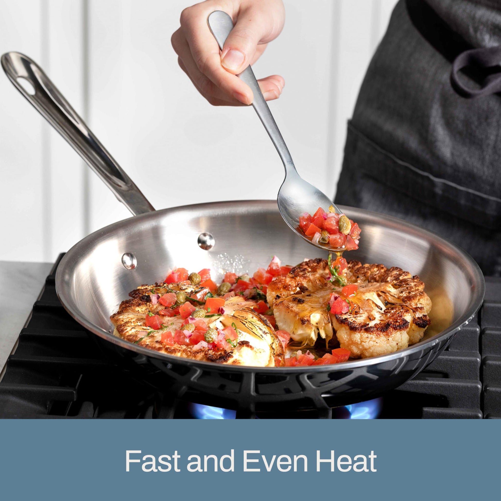 - Fast and Even Heat - D3 tri-ply is fully bonded to the rim for professional performance & durability. The high quality 18/10 stainless steel surface sears to perfection and is ideal to deglaze for pan sauces.