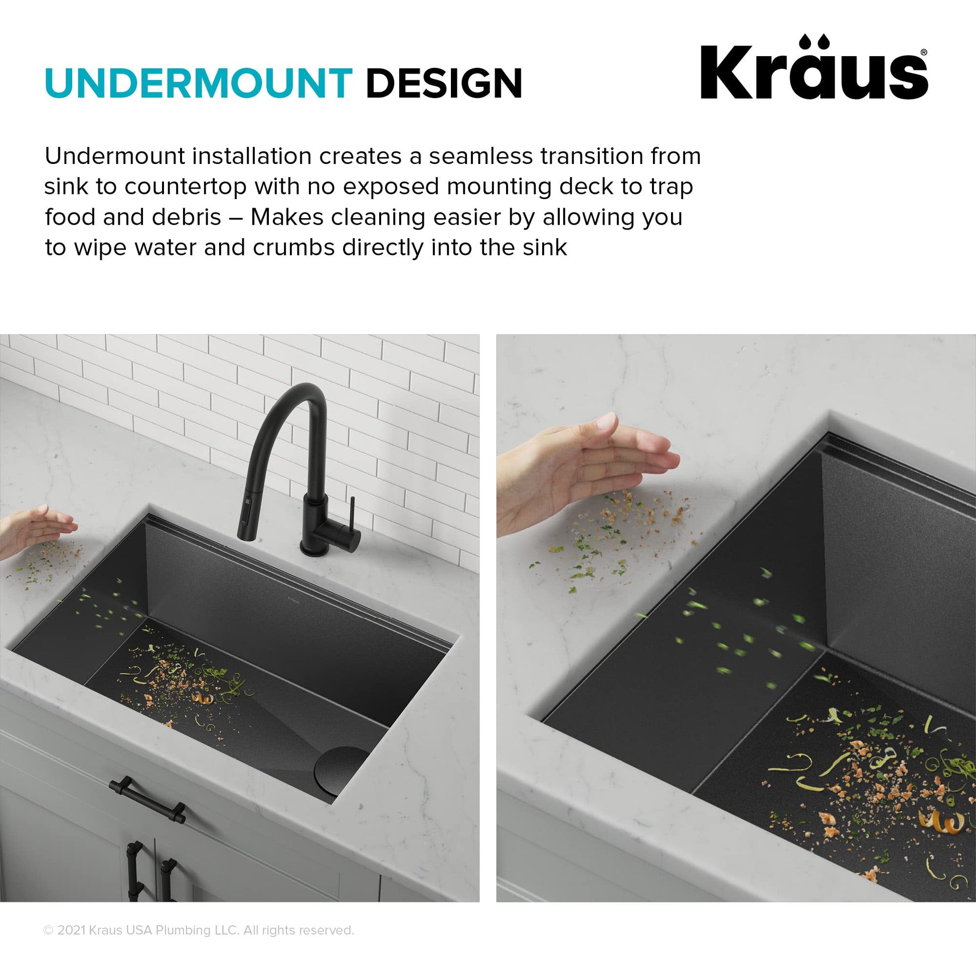 Details: Cook, serve, and entertain in style with a Kore™ Workstation Sink in bold Black PVD Gunmetal finish. Offering a unique color option, this Kraus sink has a modern yet timeless appearance. It blends well with today’s popular black stainless steel appliances, making it a showpiece in any kitchen. This black sink kitchen pairs beautifully with black faucets as well as contrasting finishes for a look that really catches the eye. Engineered with an integrated ledge to support custom sliding accessories, this single bowl kitchen sink is designed to streamline all your kitchen tasks from meal prep to cleanup. The included cutting board and roll up dish drying rack allow you to work right over the kitchen sink black without taking up counter space. Kore™ kitchen sinks are made with KRAUS TRU16 – the thickest steel on the market – for uncompromising durability. DuraShield™ PVD finish application results in a color coating that bonds completely to the steel, greatly improving durability with superior resistance to abrasion, chips, and corrosion. Sandblasted matte texture resists water spots and fingerprints while enhancing the modern appearance of the undermount sink. Undermount installation creates a clean transition between sink and countertop, with no exposed mounting deck to trap food and debris. Designed for effective drainage, this black stainless steel sink with offset drain easily accommodates your biggest cookware. The kit comes with matching accessories, including a stainless steel bottom grid and a sink protector, completing the sink for kitchen setup.