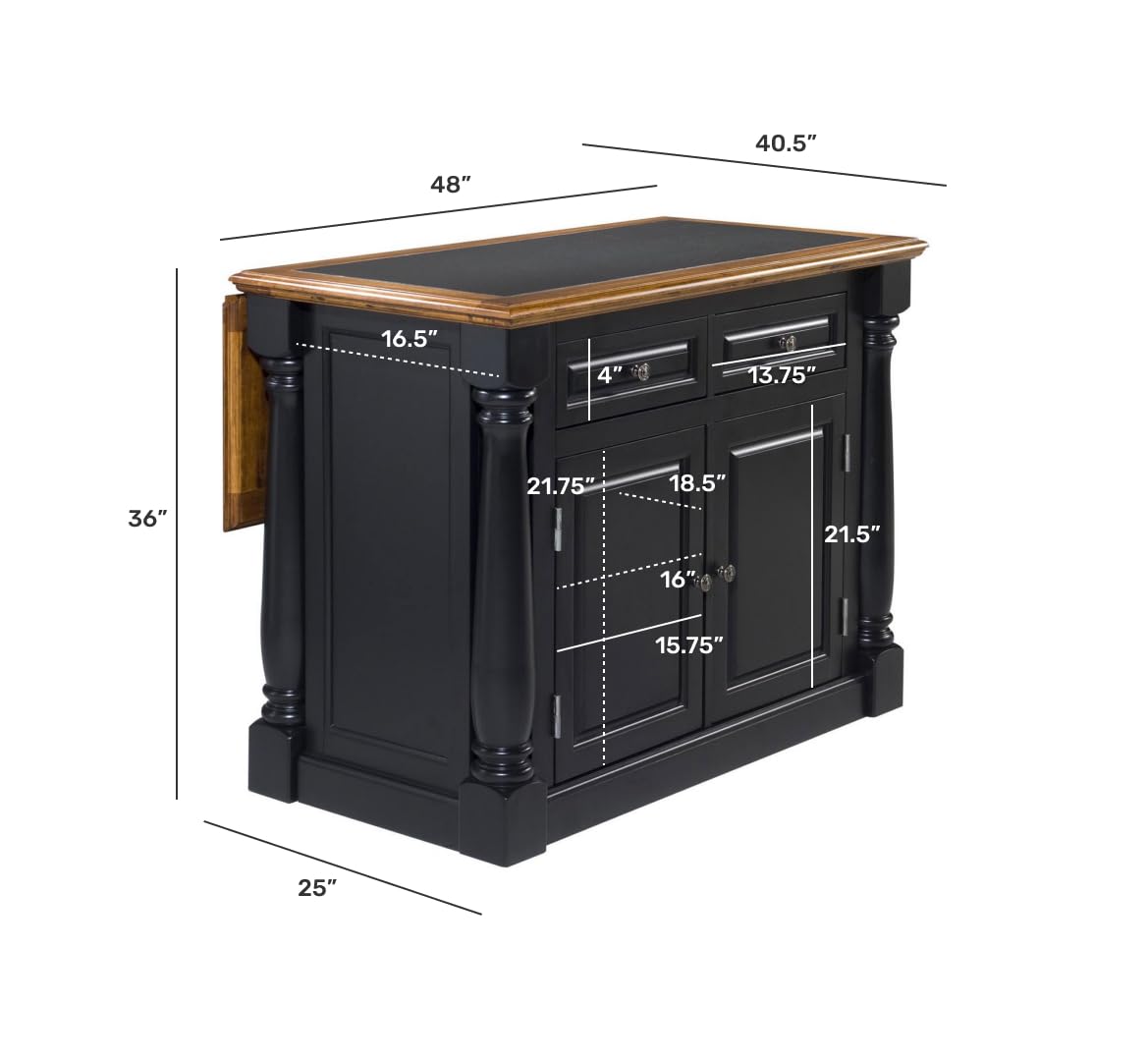 Details: At the center of the kitchen of your dreams lies the Homestyles Monarch Kitchen Island. This solid hardwood top features a granite inlay and a base with columns on each corner that move to support the drop leaf that creates more room for either prep space or additional seating. The combination of drawers and shelves gives you the storage flexibility needed for pots, pans and countertop appliances.
